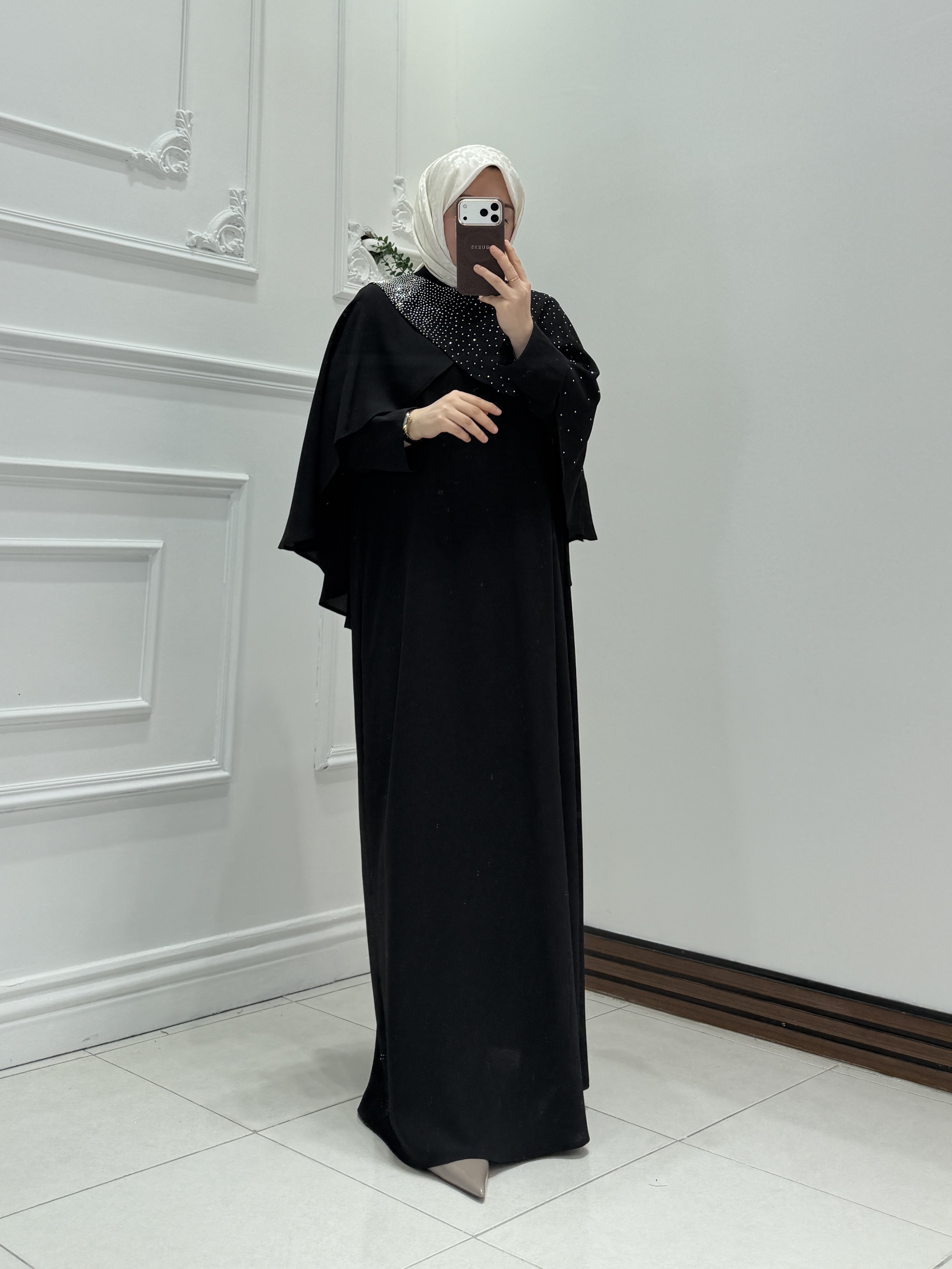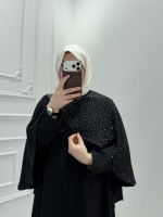 Özel tasarlanan pelerin detayı ve omuzdan göğüs kısmına yayılan zarif taş işlemeleri ile şık ve asil bir duruş sunar. Rahat kalıbı sayesinde vücut hatlarını belli etmez, akışkan bir görünüm sağlar.